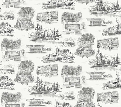 Tropical Sketch Toile Black Wallpaper with Eclectic Toile Pattern - York RT7841