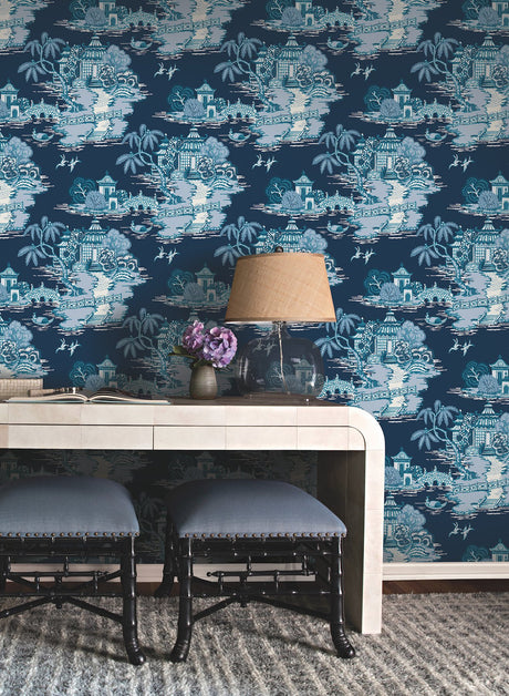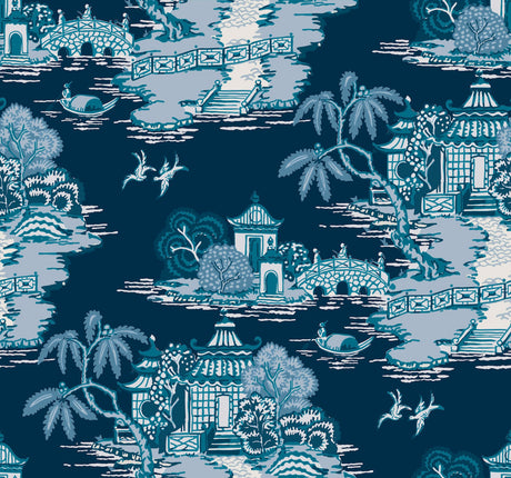 Pagoda And Sampan Scenic Navy Toile Non Woven Wallpaper, Modern Style - York RT7901
