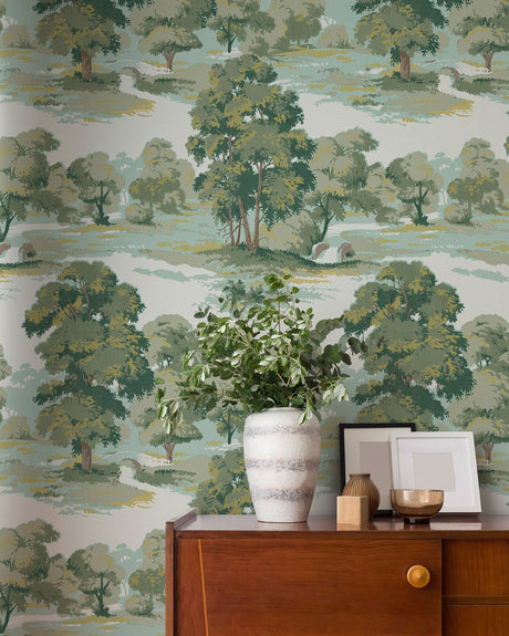 Sherwood Green Glade Wallpaper with Traditional Botanical Trees Motif - 4164-M1829