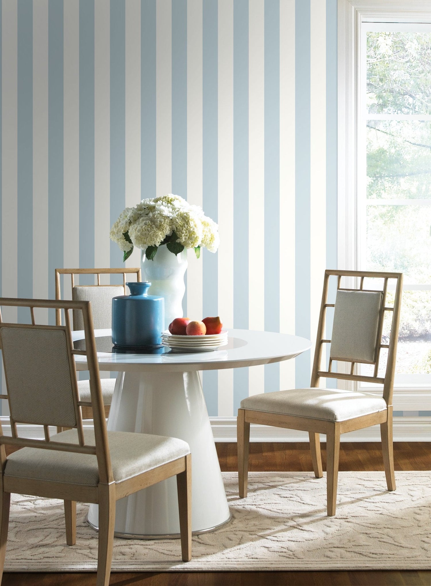 Conjuring thoughts of beach cabanas and summer soirees slip away in 3" Stripe Wallpaper. This 3-in Stripe Wallpaper measures approximately 20.5 inches wide by 33 feet long, covering About 56.4 square feet per roll. Manufactured on SureStrip™, a unique high performance substrate, this ultra-easy removable wallpaper is guaranteed easy to install and easy to remove; simply use water to activate.